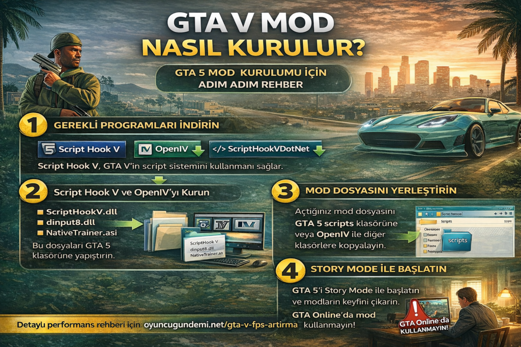 Grand Theft Auto V oyuncuları oyunu daha eğlenceli hale getirmek için mod kullanır. Çünkü modlar yeni araçlar, grafik iyileştirmeleri ve farklı oynanış özellikleri ekler. Ancak birçok oyuncu GTA V mod nasıl kurulur sorusunun cevabını merak eder. Bu rehberde GTA 5 mod kurulumunu adım adım anlatıyoruz.